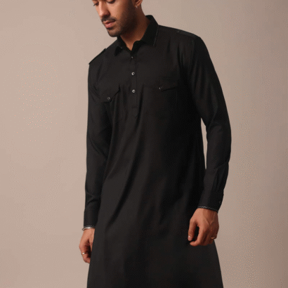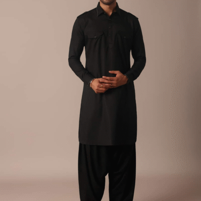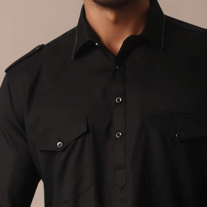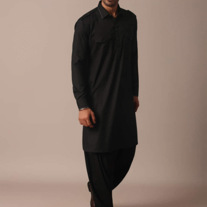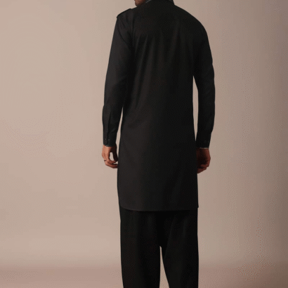 Sleek black shalwar kameez with double pockets for a modern, refined style.