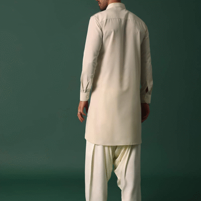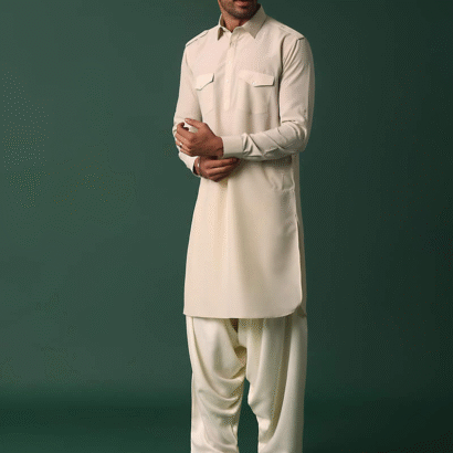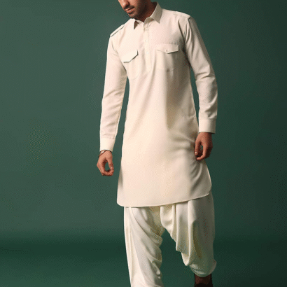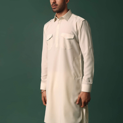 Classic white shalwar kameez with double pockets for a timeless, versatile look.